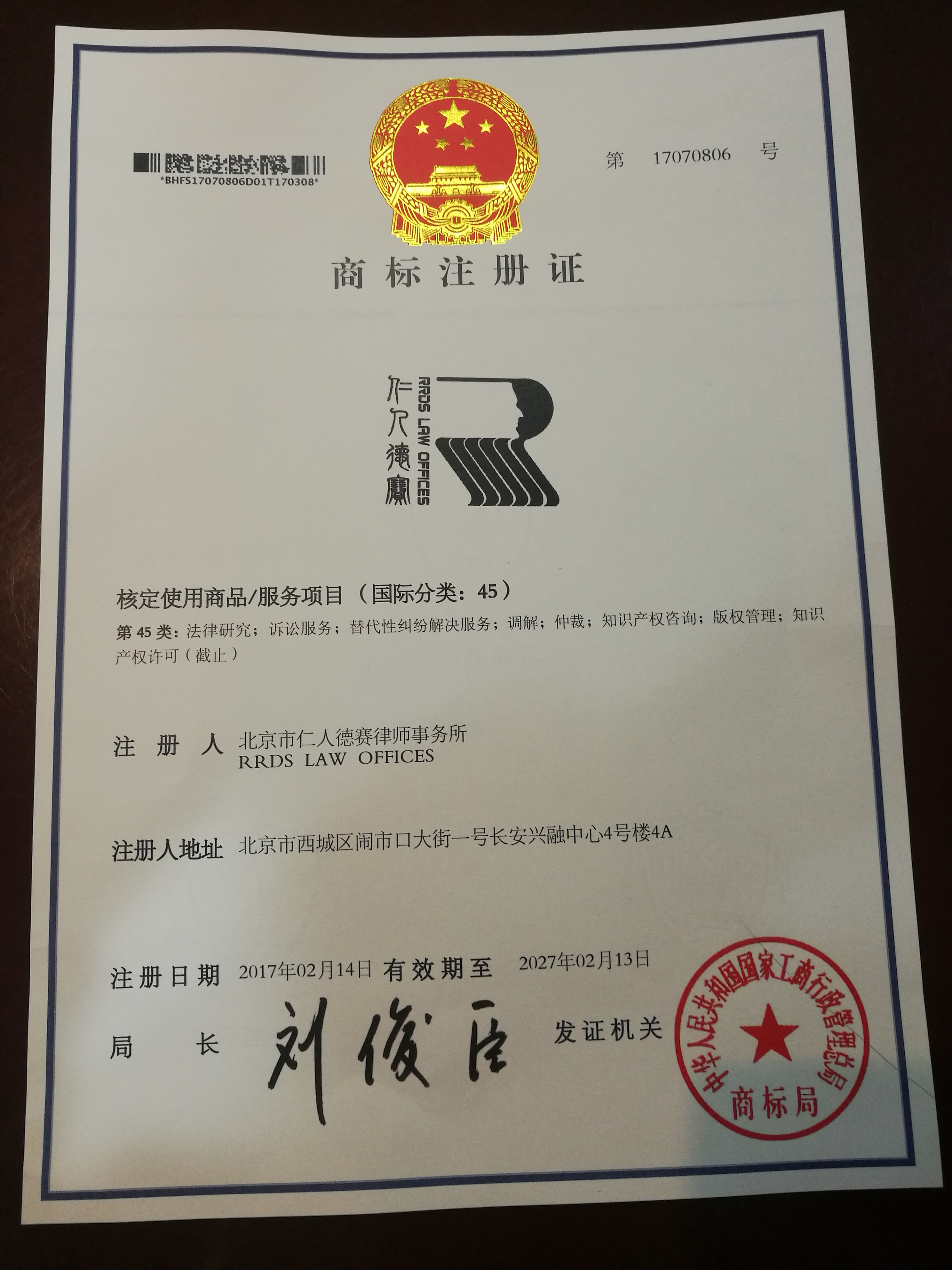 北京市仁人德赛律师事务所申请的“仁人德赛”文字商标以及“仁人德赛RRDS LAW OFFICES及图形”经国家工商行政管理总局商标局审批成功注册,该商标涵盖法律研究、诉讼服务、替代性纠纷解决服务、调解、仲裁、知识产权咨询、版权管理、知识产权许可等多项服务项目。“仁人德赛”商标成功注册有利于北京市仁人德赛律师事务所打造特色律所品牌,为仁人德赛所在律师界发展起到了积极作用。